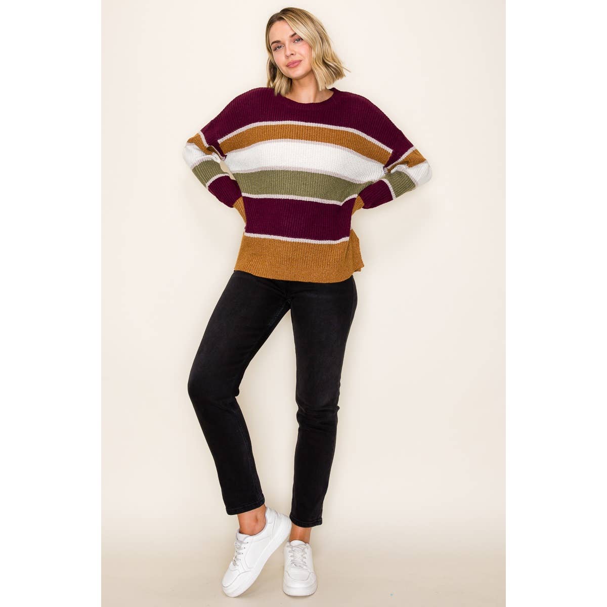MULTI COLOR BLOCK STRIPED, LONG SLEVE, CREW NECK PULLOVER SWEATER