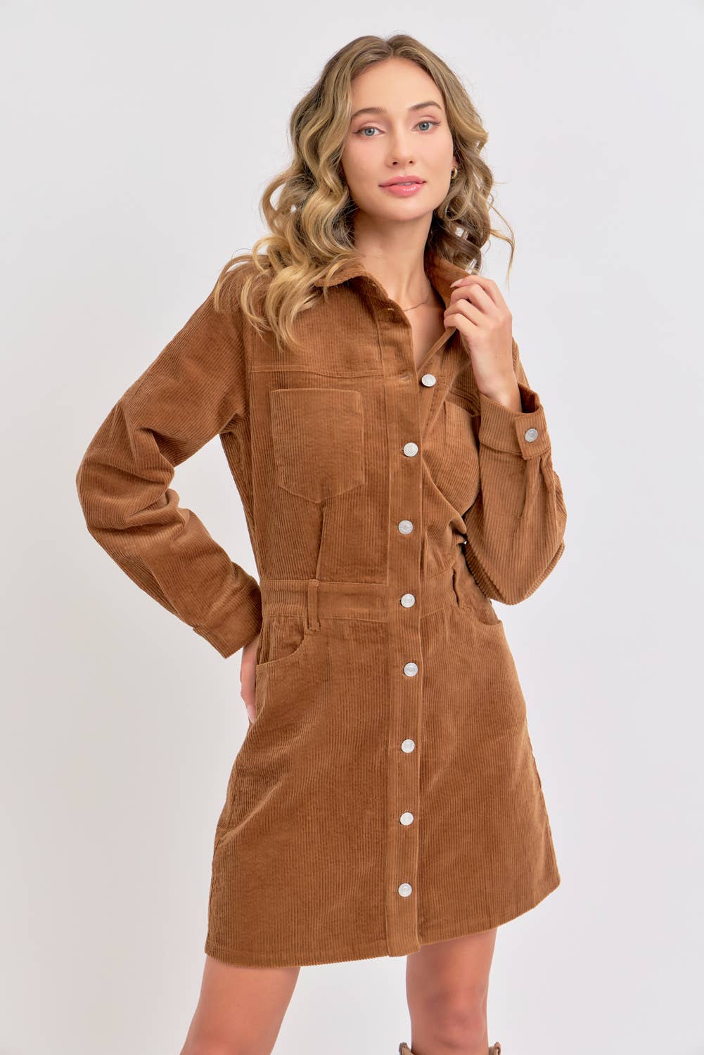 SO ESSENTIAL AND FOREVER TIMELESS MINI DRESS WITH LAPEL COLLAR AND LONG SLEEVES. FRONT AND BACK POCKETS. NOW IN RELAXED SILHOUETTE MADE WITH WASHED STRETCH CORDUROY 98% COTTON 2% SPANDEX. PERFECT FOR EVERYDAY CASUAL LOOK. *DETAIL* -RELAXED FIT -LAPEL COLLAR -LONG SLEEVE -FRONT AND BACK POCKETS -FRONT METAL BUTTON CLOSURE -IMPORT